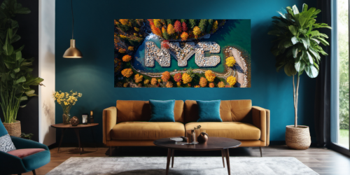 From this aerial perspective, the interplay of the deep rock, the surrounding water, and the vibrant, fire-kissed foliage of the changing season coalesce to form an uncanny, unmistakable silhouette. The spitting image of the familiar 'NYC' emblem with its bold, simple lines.